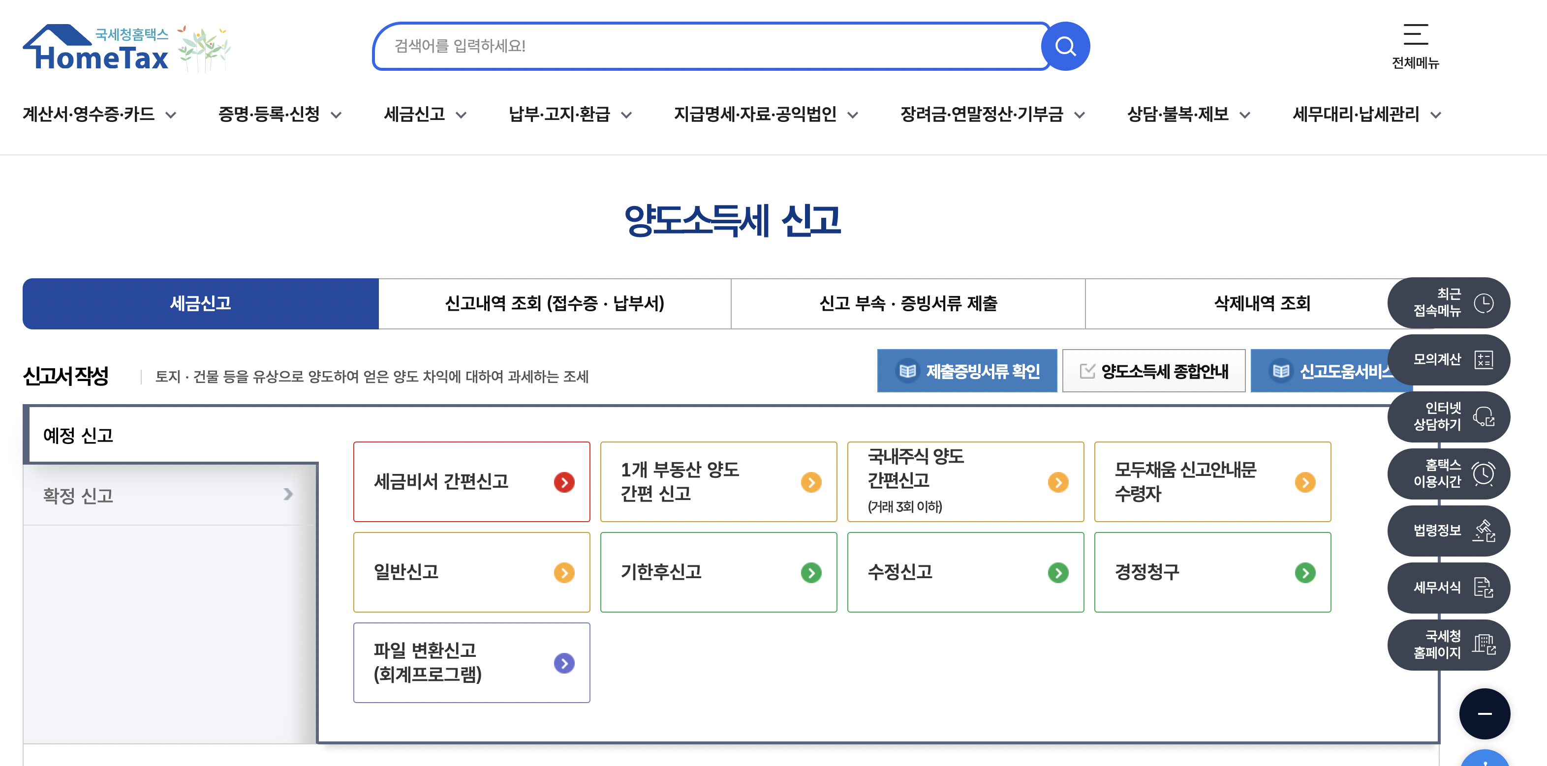 - 세금신고 → 양도소득세 신고 → 확정신고 → 정기신고 선택
